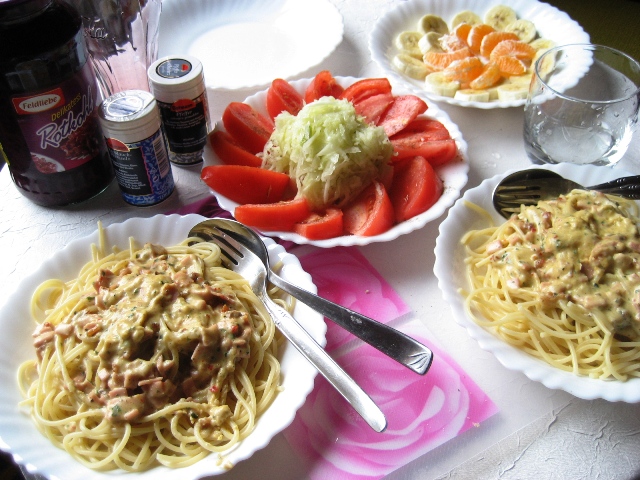 そしてさおり宅の残り物のトマトソースをかけて完成